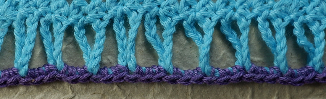 And double Zig-zag?In this example the first strip is edged and then the strips joined as the second strip is edged. I have also gathered the loops together, joining two loops with a single Double-crochet.